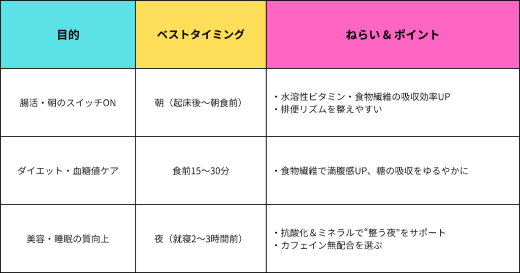 そして、ダイエット・美容・腸活それぞれの狙いに合わせて、今日から一番効果が出やすい飲み方にアップデートしましょう。