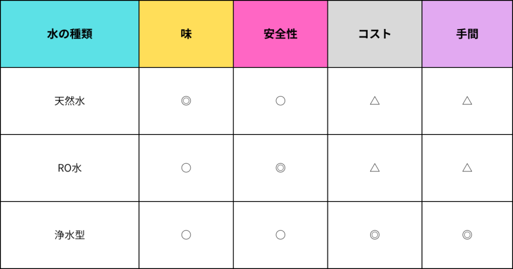 - 自分や家族の用途に合う水か