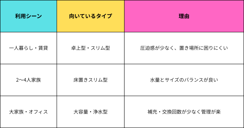 👉 使用量が少ない家庭では、小容量ボトル・浄水型を選ぶと無駄が出にくくなります。