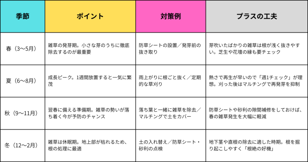 雑草は1年を通して姿を変えながら増えていきます。そのため、「季節ごとの習性」に合わせた対策を続けることが成功のカギです。