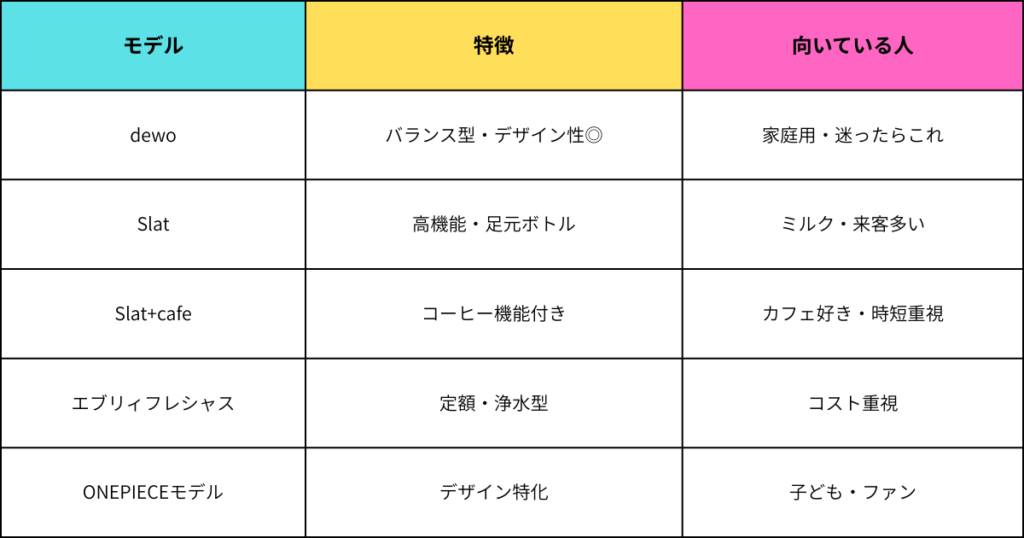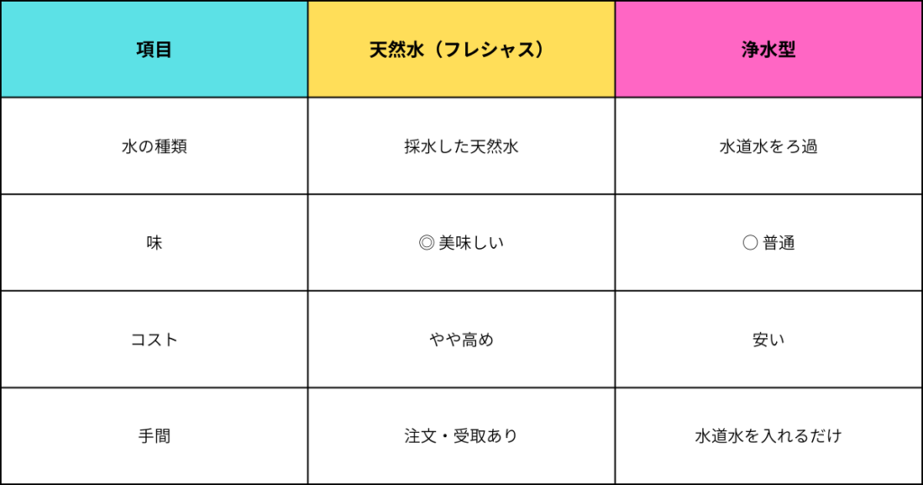 とくに、フレシャスは「天然水×デザイン性×使いやすさ」に強みがあるサーバー。そのため、まずは「何が違うのか」を理解することで、自分に合うかどうかがハッキリ分かります。