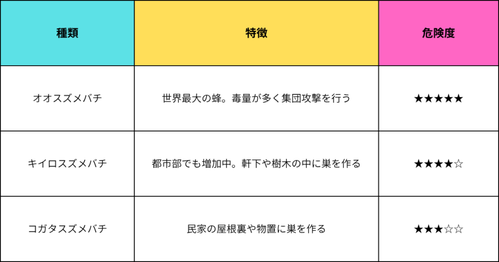 スズメバチは日本で最も攻撃性と毒性が高い蜂。そして、代表的な種類には次のような特徴があります。