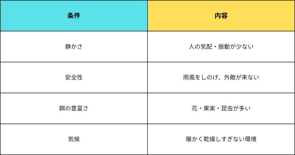 逆に、風通しが悪く湿度が高い場所は苦手です。つまり、「明るく乾いた静かな場所」が巣作りの候補になりやすいのです。