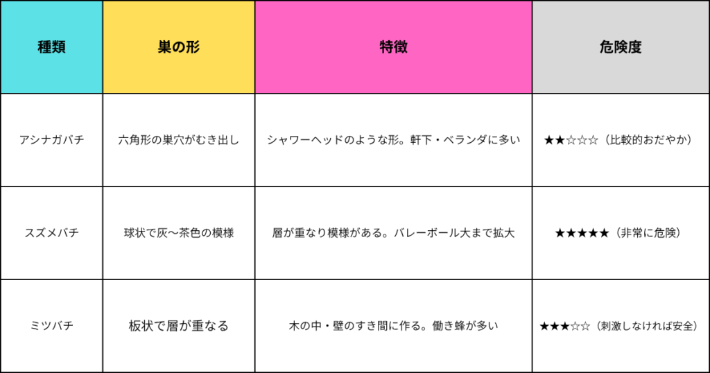 一口に「蜂」といっても、アシナガバチ・スズメバチ・ミツバチでは生態も危険度もまったく異なります。