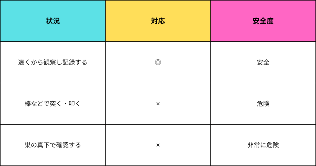 蜂の巣を見つけたら、慌てず・近づかず・冷静に観察することが大切です。