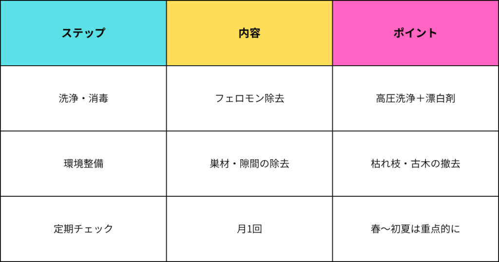 蜂の巣を駆除しても、再び作られるケースは少なくありません。しかし、駆除後の3ステップメンテナンスを徹底するだけで、再発リスクを大幅に減らせます。