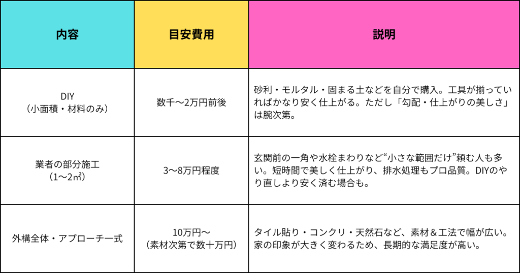 外構まわりの舗装や小規模施工は、DIYと業者で必要な費用が大きく変わるのが現実です。