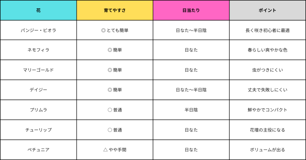 春は育てやすい花が豊富ですが、その中でも特に「失敗しにくく、変化が分かりやすい」花を選ぶと、ガーデニングがぐっと楽しくなります。