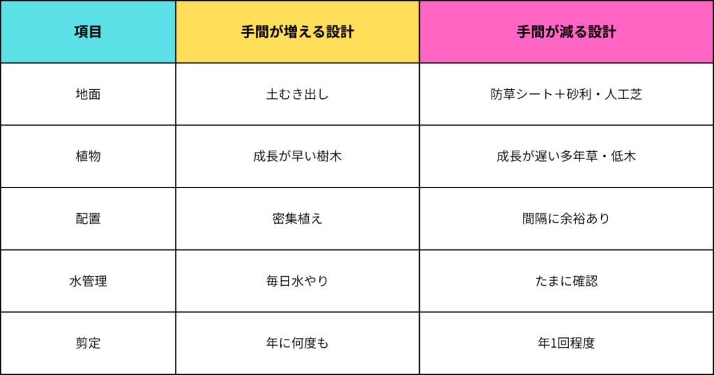 つまり、手間なし庭づくりの本質は「抜く・水やりする・切る」作業を「発生しにくくする設計」にあります。