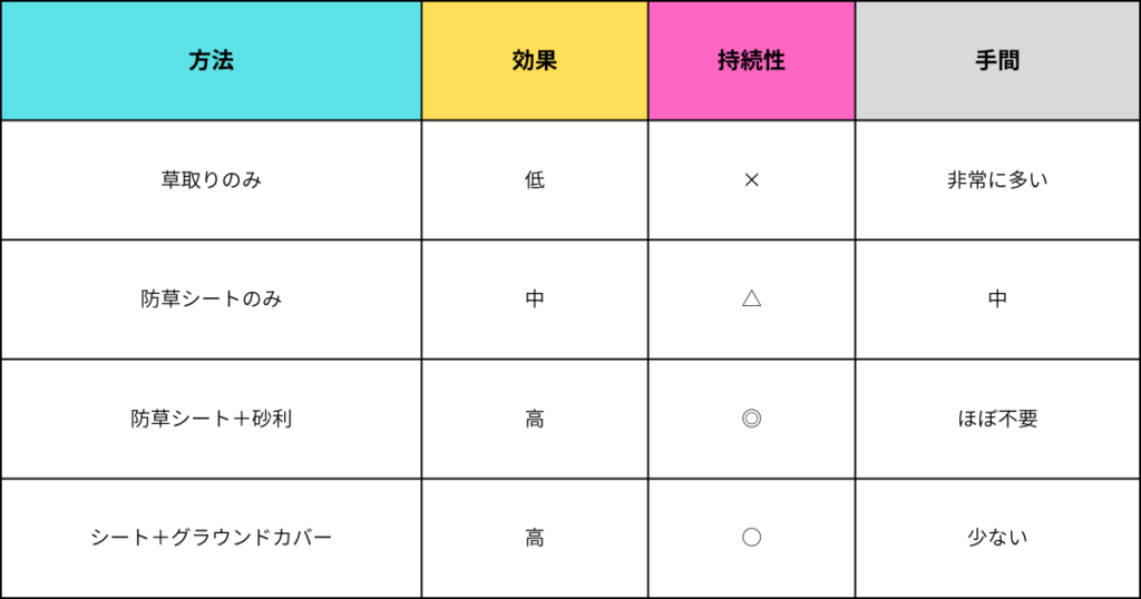 防草シートは「素材」より「施工」で差が出ます。とくに、固定が甘い・重ね不足・砂利が薄いと、雑草はスキマから侵入して復活します。