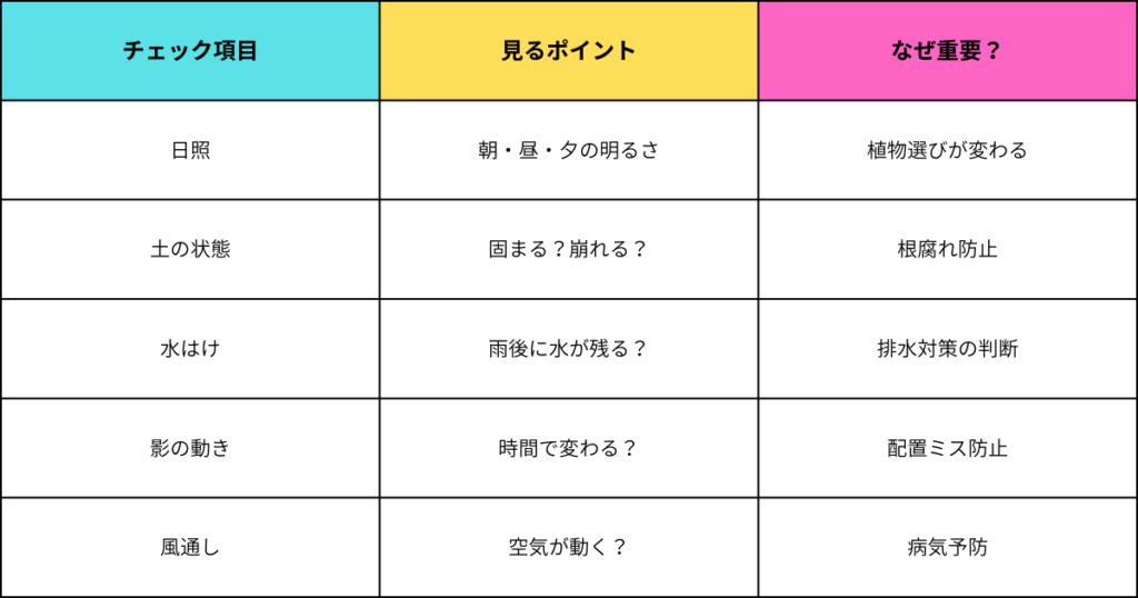 👉 「花が咲かない場所」ではなく「花の種類を選ぶ場所」と考えると成功しやすいです。