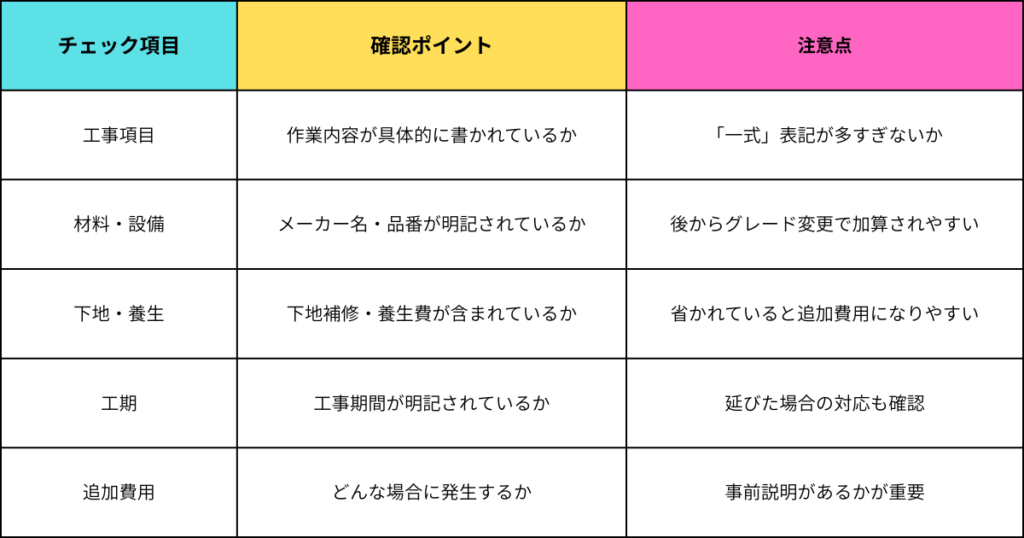👉 これを事前に確認しておくことで、「工事が始まってからの追加費用」を防ぎやすくなります。